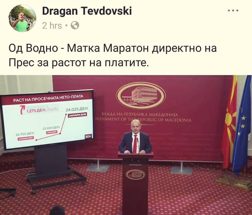 Министерот за финансии, Драган Тевдовски, сериозно мисли дека никој нема да се смее на неговиот статус, кој, го постираше на социјалните мрежи на 23 март, 2018 година. Оној, дека на прес конференцијата за епохалниот „раст на плати“, досега невиден во македонска историја, како што претходно ни соопштија од владеачката СДСМ, ни ,,долетал“ од Маратон Водно-Матка.