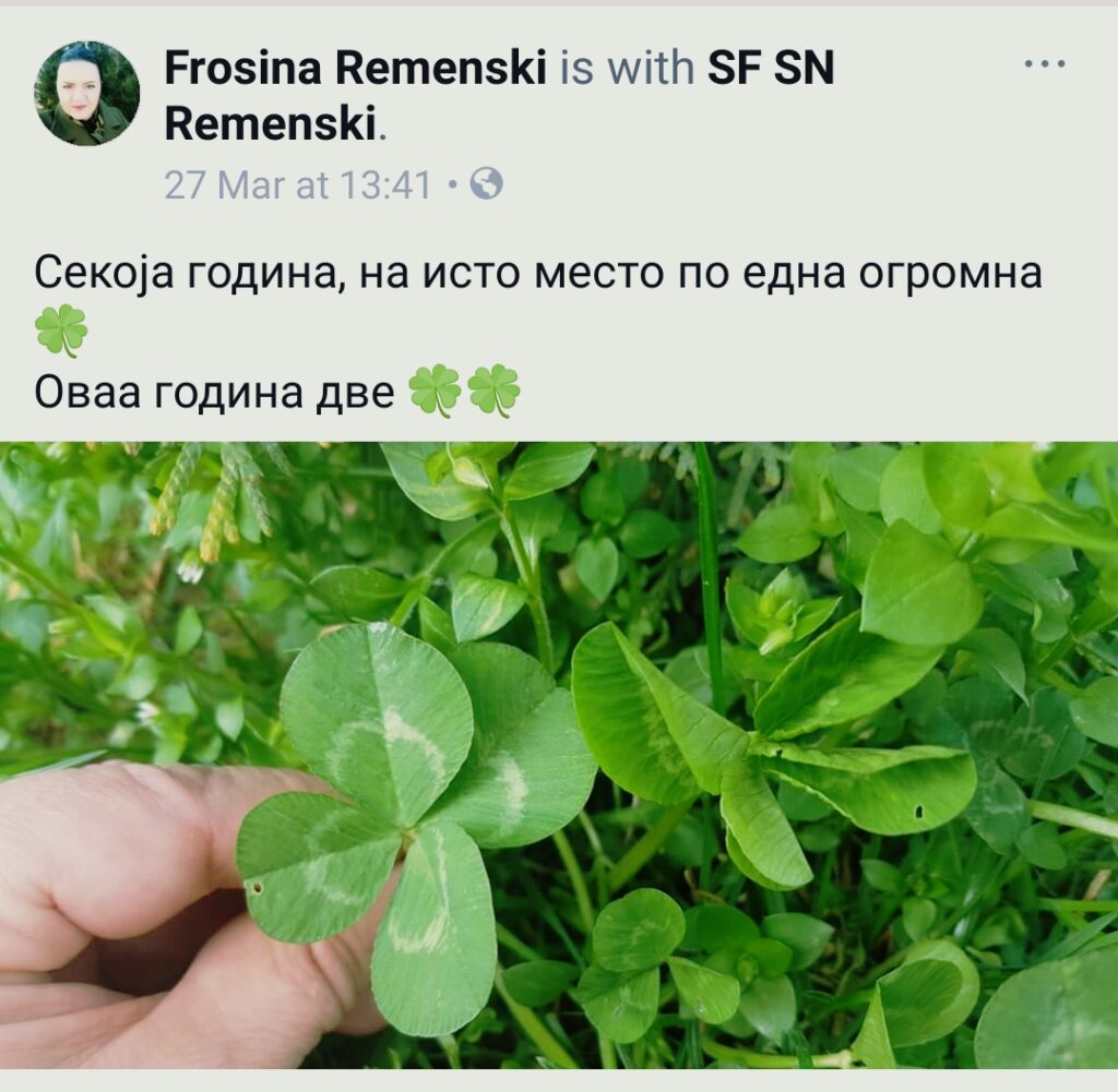 Пратеничката Фросина Ременски, на својот ФБ профил, се пофали дека годинава, за првпат, нашла две детелинки со четири листа. Ашколсун ! Претходно наоѓала по една, а годинава ете-некако се нарушила традицијата.