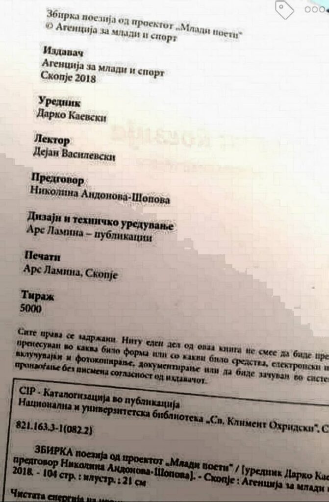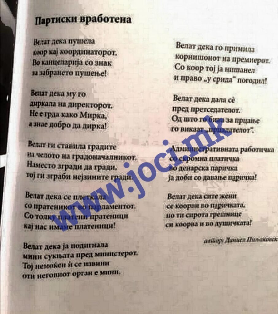 „Велат дека пушела коор кај координаторот….велат дека му го диркала на директорот..велат дека ја подигнала мини сукњата пред министерот“, вака некако изгледа „поезијата“, финансирана од Буџетот на Агенцијата за млади и спорт, испечатена во 5.000 примероци. Скандалот веќе е раширен, а јавноста врие. На социјалните мрежи, граѓани, го повикуваат директорот Дарко Каевски на одговорност затоа што финансирал дискриминација и шовинизам од најдолен вид.