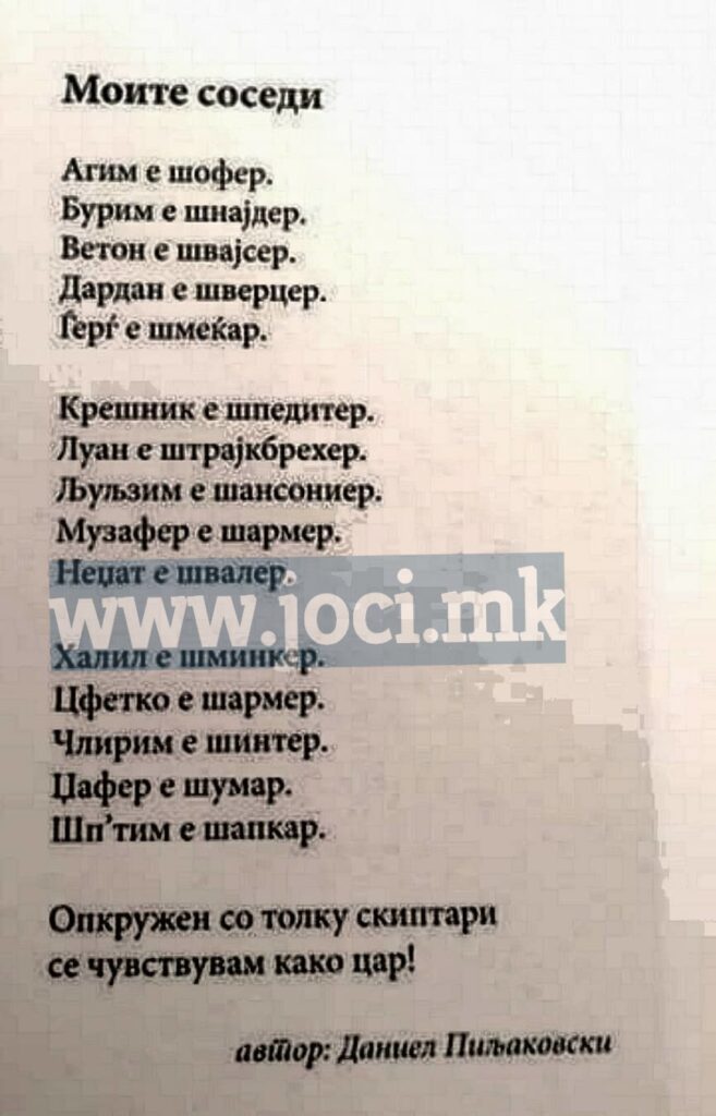 „Поезијата“ продолжува со : -„Велат дека го примила корнишонот на премиерот“ (види фото). Има и етничка дискриминација-„Агим е шофер, Бурим е шнајдер“.