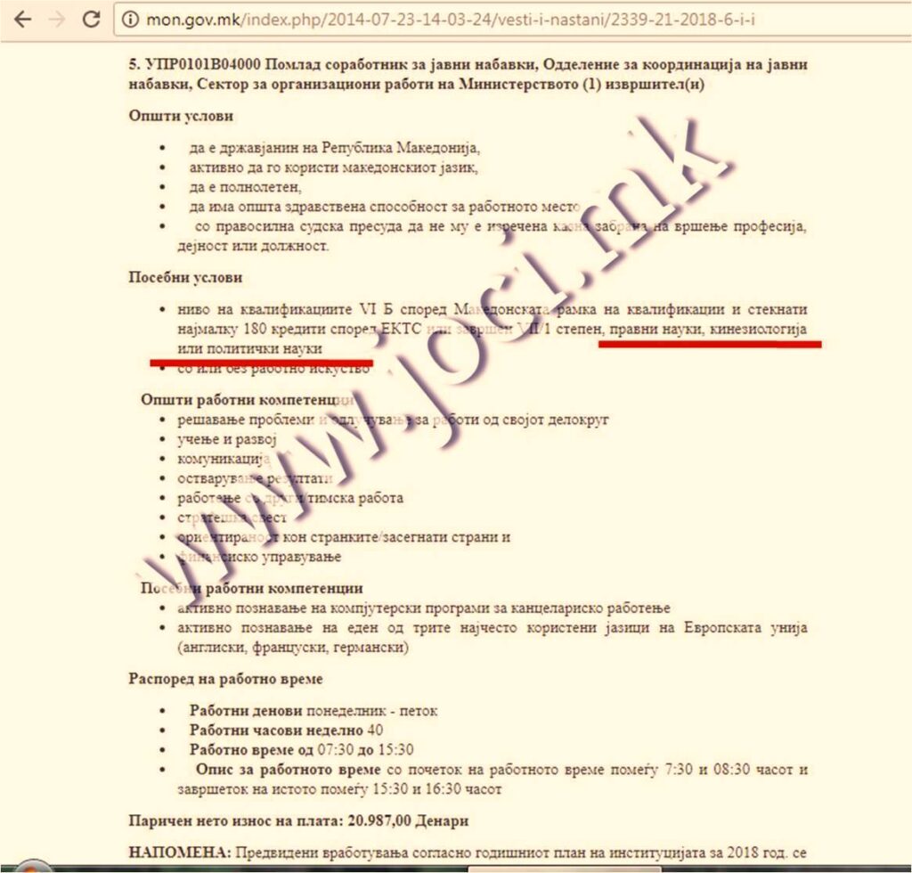 Министерството за образование и наука распишало оглас за вработување на помлад соработник во секторот за Јавни набавки на оваа институција. Во „посебните услови“ е наведено дека се бара лице кое поседува 6Б квалификации од правните науки, политичките науки или кинезиологија.