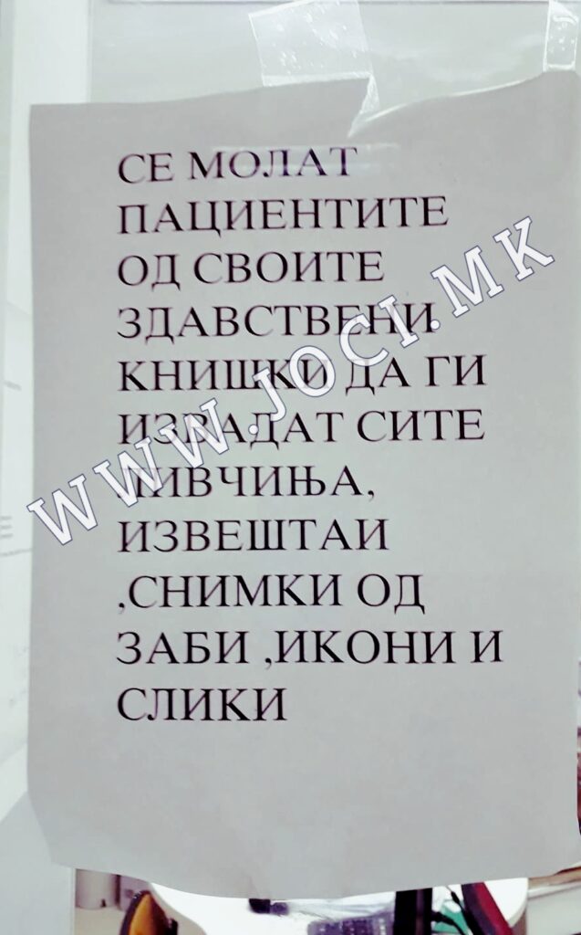 Досетливи здравствени работници, на прозорецот од приемниот шалтер, залепиле информативно ливче, со кое апелираат до пациентите да не оставаат ништо во своите здравствени книшки, чисто ако им ги изгубат, да имаат „алиби“ да не им се качат на глава, да се создаваат нервози, тензии и сè она, имено, кое е секојдневие во македонските амбуланти.