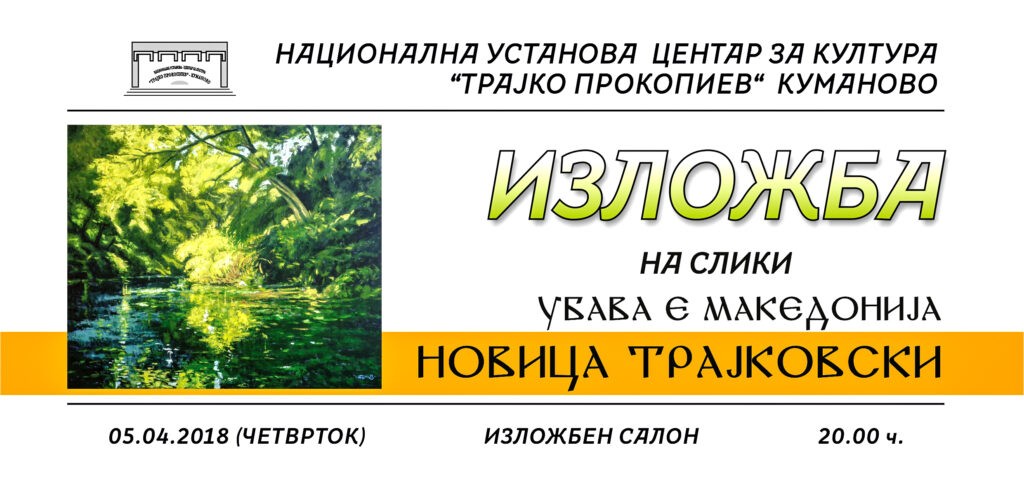 Центарот за култура „Трајко Прокопиев“- Куманово, в четврток, со почеток во 20 часот, ќе организира изложба на академскиот уметник, Новица Трајковски. Изложбата „Убава е Македонија“, која е дел од годишната програма на Националната установа „Трајко Прокопиев“ за 2018 година, ќе се одржи во Изложбениот салон.
