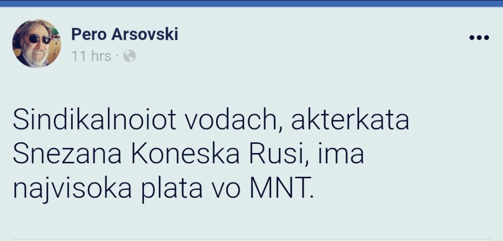 На Арсовски, познат и по улогата на Бугер во ,,Среќна Нова ’49” му пречи платата на Конеска-Руси, која зад себе има 45-годишна кариера и многу награди, меѓу нив и високата награда “13 Ноември”. Таа, во моментов, е претседател на синдикатот на актери при МНТ.
