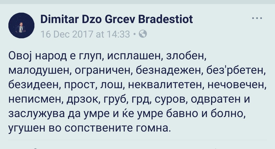 -Овој народ е глуп, исплашен, злобен, малодушен, ограничен, безнадежен, без’рбетен, безидеен, прост, лош, неквалитетен, нечовечен, неписмен, дрзок, груб, грд, суров, одвратен и заслужува да умре и ќе умре бавно и болно, угушен во сопствените гомна-, напишал тој.