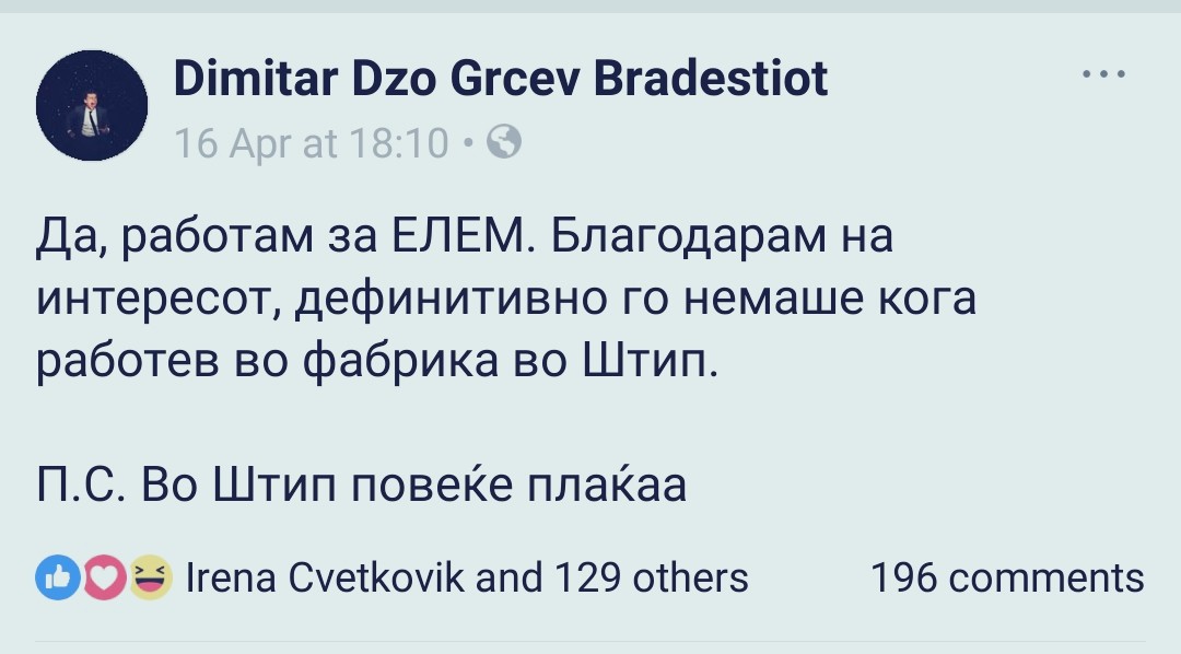 Туку, што мисли синот Грчев за народот, кој, сега му дава плата во ЕЛЕМ, од свои даноци и други давачки, ни објаснил самиот тој во декември 2017 година во статус на ФБ.