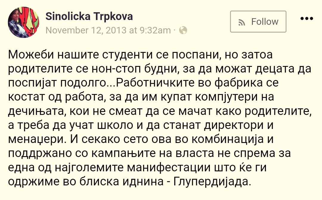 Од оваа дистанца, нема поголема иронија да си иштанцал толку многу фермани за неправди и милион луѓе да ти поделиле аплауз за таа борба, да си делел лекции за принципи, а на крај прикаската да добие капиталистичко-експлоататорски пресврт и да ти штрајкуваат луѓе за неисплатени бедни плати.