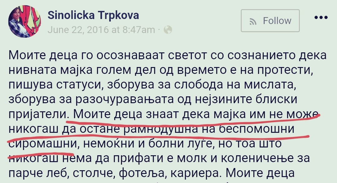 Каде си сега да застанеш на страната на сиромашните и обесправените ? И тие мајки-шивачки од вашата фабрика, раскостени од работа-имаат деца.