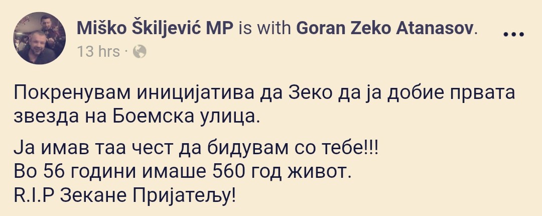(ИН МЕМОРИРАМ) Горан Атанасов-Зеко (56), скопската урбана легенда на ноќниот живот во 90-те години, по кратко боледување- вчера замина во вечноста. Неговите пријатели, познаници, бизнис соработници, со очигледна тага и во шок, оставаат безброј пораки на социјалните мрежи.