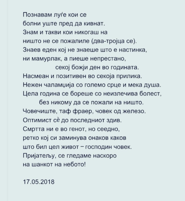 Поетот Јовица Ивановски-Џовани му посвети песна со наслов ,,Господин човек”.