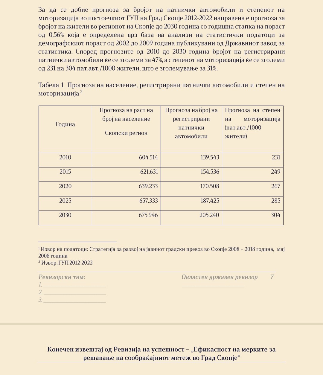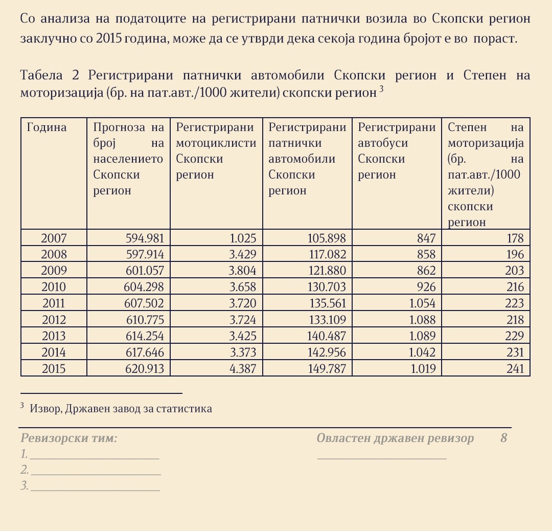 Според извештај на Државен завод за ревизија, базиран на податоци од Државен завод за статистика, во Скопје, има 267 автомобили на 1.000 жители. Односно, на 640.000 жители има регистрирано 170.500 автомобили.
