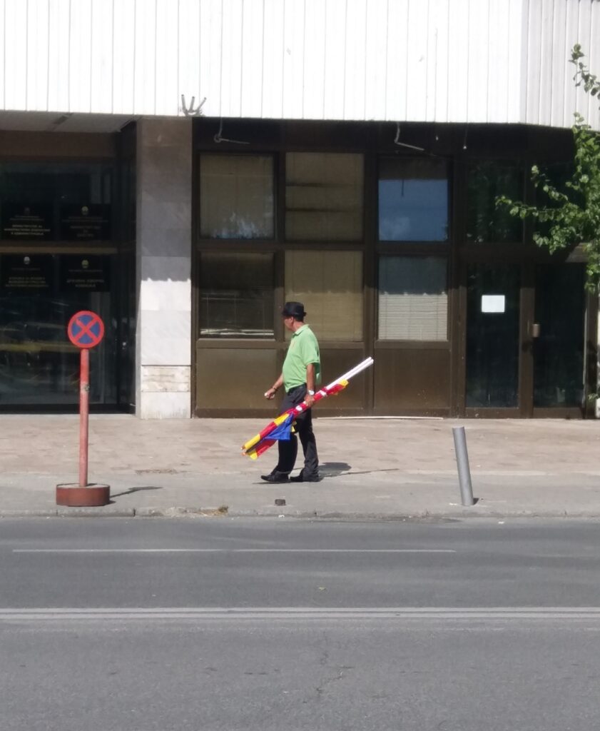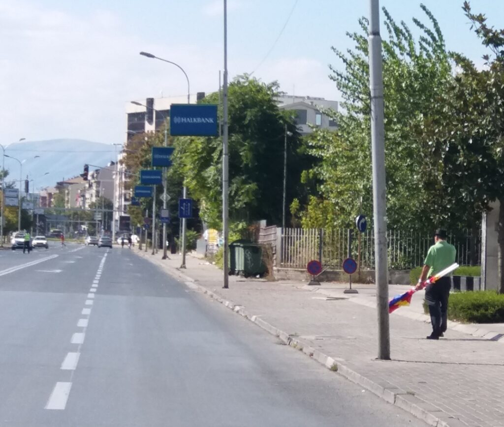 Човек, со македонско и европско знаме во рацете, чекори по празна улица, во спротивен правец од локацијата каде започна маршот ,,За европска Македонија” во организација на партијата на власт- СДСМ.