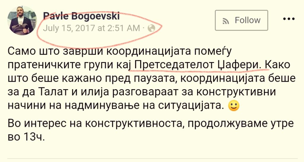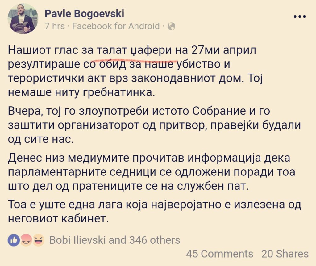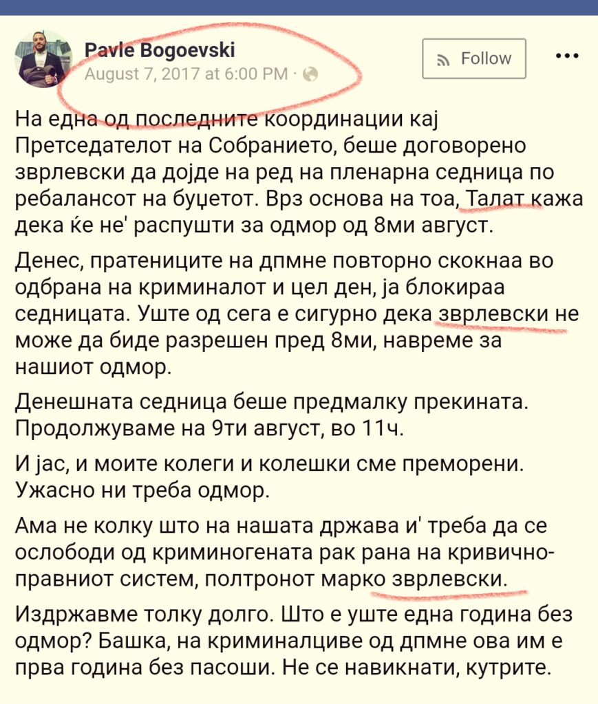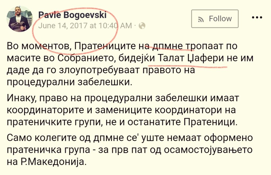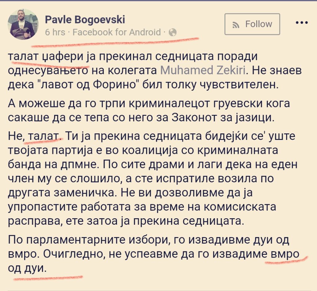 За пратеникот Павле Богоевски, Претседателот на Собранието од ДУИ, Талат Џафери, од денеска е ,,талат џафери”. Претажно ! А, ДУИ, коалициониот партнер на СДСМ, тој во своите статуси го пишува со мали букви- ,,дуи”. Идентично како што го именува ,,вмро”. Со таа разлика што Павлево, избран од пратеничката листа на СДСМ, го гласаше Талат Џафери.