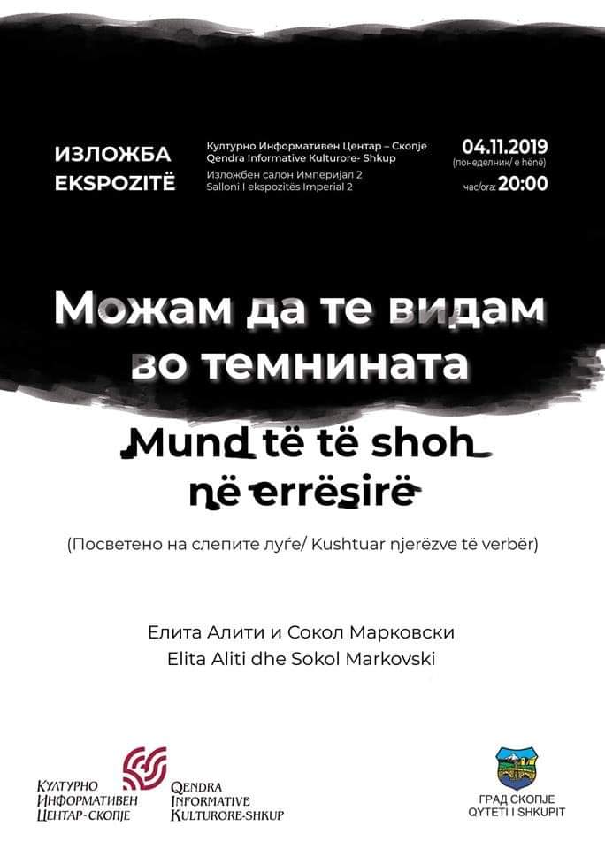 Во Културно Информативниот Центар (КИЦ), во изложбениот салон – Империјал 2, утре (4.11.2019 година) во 20 часот, ќе биде отворена изложбата „Можам да те видам во темнината“, од Елита Алити и Сокол Марковски. Изложбата е посветена на слепите лица.