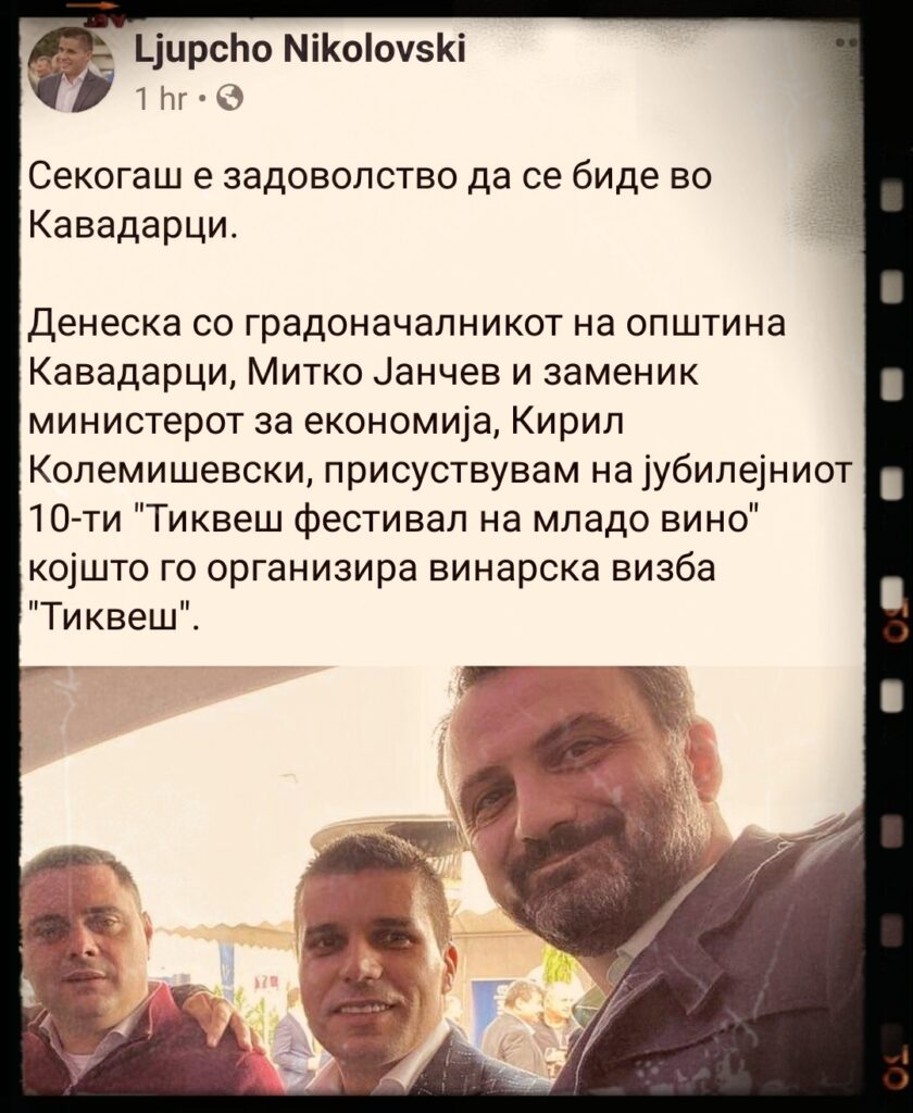 Π’ΡΠΊΡ, ΠΎΠ²ΠΎΡΠΏΠ°Ρ, ΠΊΠ°Π²Π°Π΄Π°ΡΠ΅ΡΠΊΠΈΠΎΡ Π³ΡΠ°Π΄ΠΎΠ½Π°ΡΠ°Π»Π½ΠΈΠΊ, ΠΏΠΈΠ΅Π» ΠΌΠ»Π°Π΄ΠΎ Π²ΠΈΠ½ΠΎ ΡΠΎ ΠΡΠΏΡΠΎ ΠΠΈΠΊΠΎΠ»ΠΎΠ²ΡΠΊΠΈ, ΡΠ΅ΡΠΎΡ Π½Π° ΠΈΠ·Π±ΠΎΡΠ΅Π½ ΡΡΠ°Π± Π½Π° Π‘ΠΠ‘Π ΠΈ ΠΠ΅Π½Π΅ΡΠ°Π»Π΅Π½ ΡΠ΅ΠΊΡΠ΅ΡΠ°Ρ Π½Π° ΠΏΠ°ΡΡΠΈΡΠ°ΡΠ°, ΠΊΠ°ΠΊΠΎ ΠΈ ΡΠΎ Π·Π°ΠΌΠ΅Π½ΠΈΠΊ-ΠΌΠΈΠ½ΠΈΡΡΠ΅ΡΠΎΡ Π·Π° Π΅ΠΊΠΎΠ½ΠΎΠΌΠΈΡΠ°, ΠΠΈΡΠΈΠ» ΠΠΎΠ»Π΅ΠΌΠΈΡΠ΅Π²ΡΠΊΠΈ, Π°Π΄Π²ΠΎΠΊΠ°Ρ, Π° ΡΠ²ΠΎΠ΅Π²ΡΠ΅ΠΌΠ΅Π½ΠΎ ΠΈ ΡΠ»Π΅Π½ Π½Π° Π³ΡΡΠΏΠ°ΡΠ° ,,ΠΠΎΠΊΠ°ΡΡ”. ΠΠΎΠ²ΠΎΠ΄ Π·Π° Π΄ΡΡΠΆΠ±Π°ΡΠ° Π±ΠΈΠ»Π° ,,Π’ΠΈΠΊΠ²Π΅Ρ ΡΠ΅ΡΡΠΈΠ²Π°Π» Π½Π° ΠΌΠ»Π°Π΄ΠΎ Π²ΠΈΠ½ΠΎ”.