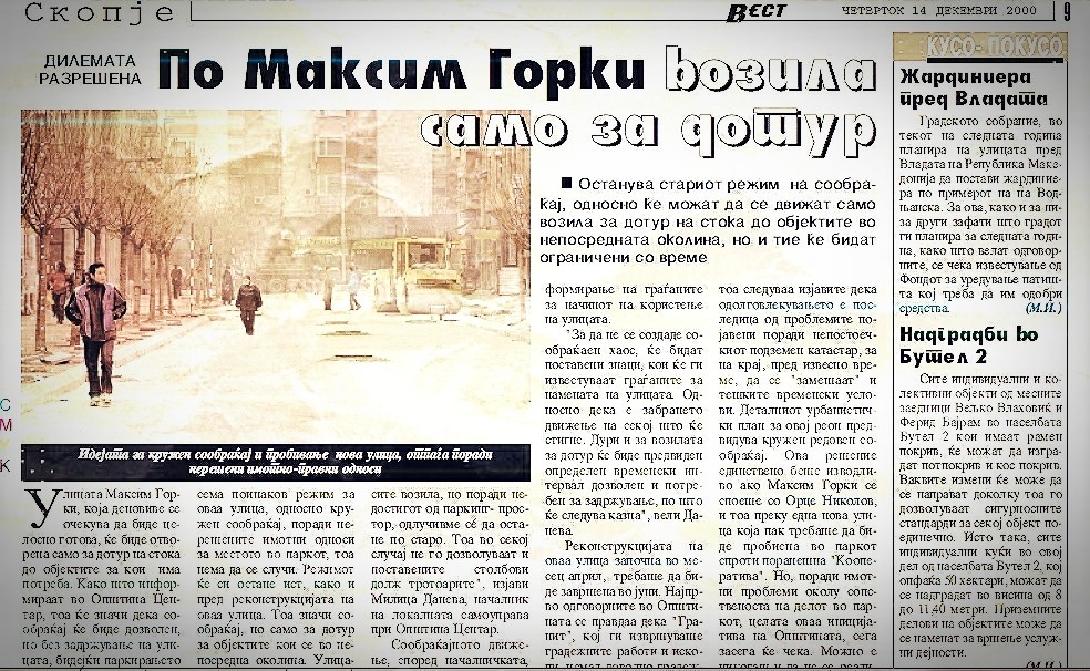 Во април 2000-та година започна реконструкцијата на улицата Максим Горки, а претходно нов дрворед со јапонските цреши оформи тогашниот градоначалник на Општина Центар, Мирослав Грчев. ( Мандат: 1996-2000 г.)