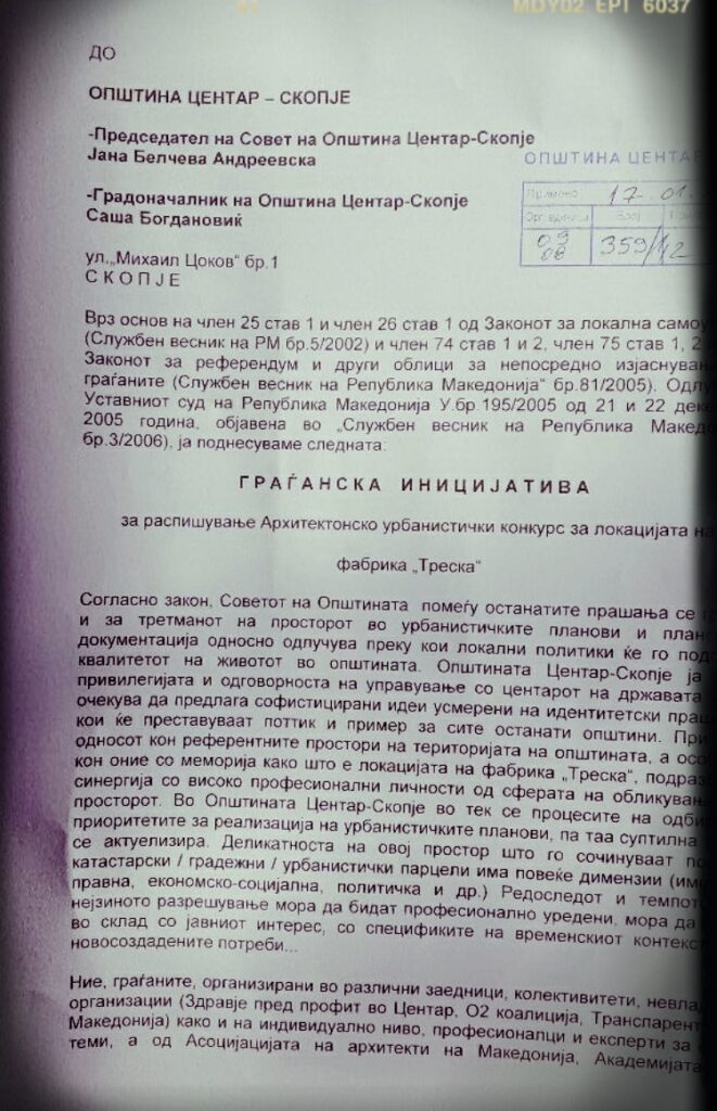 ,,ГРАЃАНСКА ИНИЦИЈАТИВА ЗА РАСПИШУВАЊЕ НА АРХИТЕКТОНСКО-УРБАНИСТИЧКИ КОНКУРС ЗА ЛОКАЦИЈАТА НА ФАБРИКА ,,ТРЕСКА”