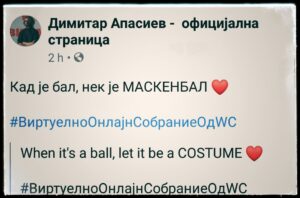 Некои од амандманите објави лично Апасиев, човекот кој носи црни кошули веројатно и за празник и за погреб, со тон кој труе на нечовештина, на некоја длабоко несреќна судба и многу непрележани ,,детски болести” чии чиреви излегуваат на површина во 2020 година, додека зема плата од околу 1.500 евра народни пари за да работи за доброто на државата, а не да ги револтира даночните обврзници со својата внатрешна пизма. Тој напиша: ,,кога е бал, нека е маскенбал. Виртуелно онлајн-собрание од WC”.