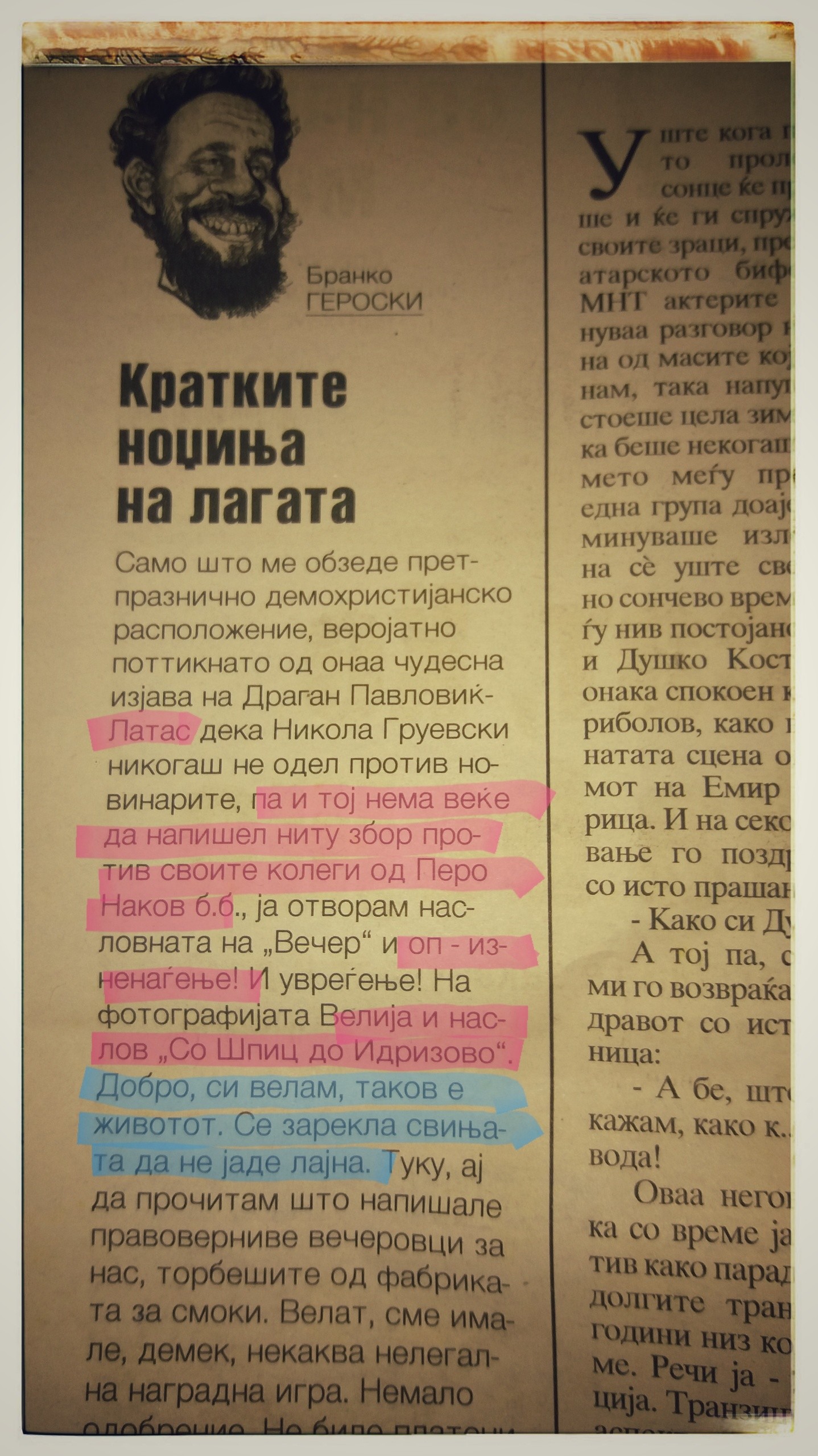 Нашиот екс ,,бард”, бидејќи веќе не е, а не се сеќаваме дали некогаш бил, за својот денешен пријател, Драган Павловиќ-Латас, тогаш напиша: ,,Само што ме обзеде демохристијанско расположение, веројатно поттикнато од онаа чудесна изјава на Латас дека Никола Груевски никогаш не одел против новинарите, па и тој веќе нема да напише ниту збор за своите колеги од Перо Наков б.б, ја отворам насловната од ,,Вечер” и оп – изненаѓење! И увреѓење! На фотографијата Велија и наслов ,,Со Шпиц до Идризово”. Добро, си велам, таков е животот. Се зарекла свињата да не јаде лајна…”
