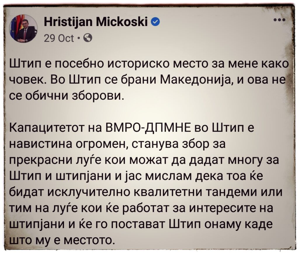 Капацитетот на ВМРО-ДПМНЕ во Штип е навистина огромен, станува збор за прекрасни луѓе кои можат да дадат многу за Штип и штипјани и јас мислам дека тоа ќе бидат исклучително квалитетни тандеми или тим на луѓе кои ќе работат за интересите на штипјани и ќе го постават Штип онаму каде што му е местото”, напиша Мицкоски пред два месеци.