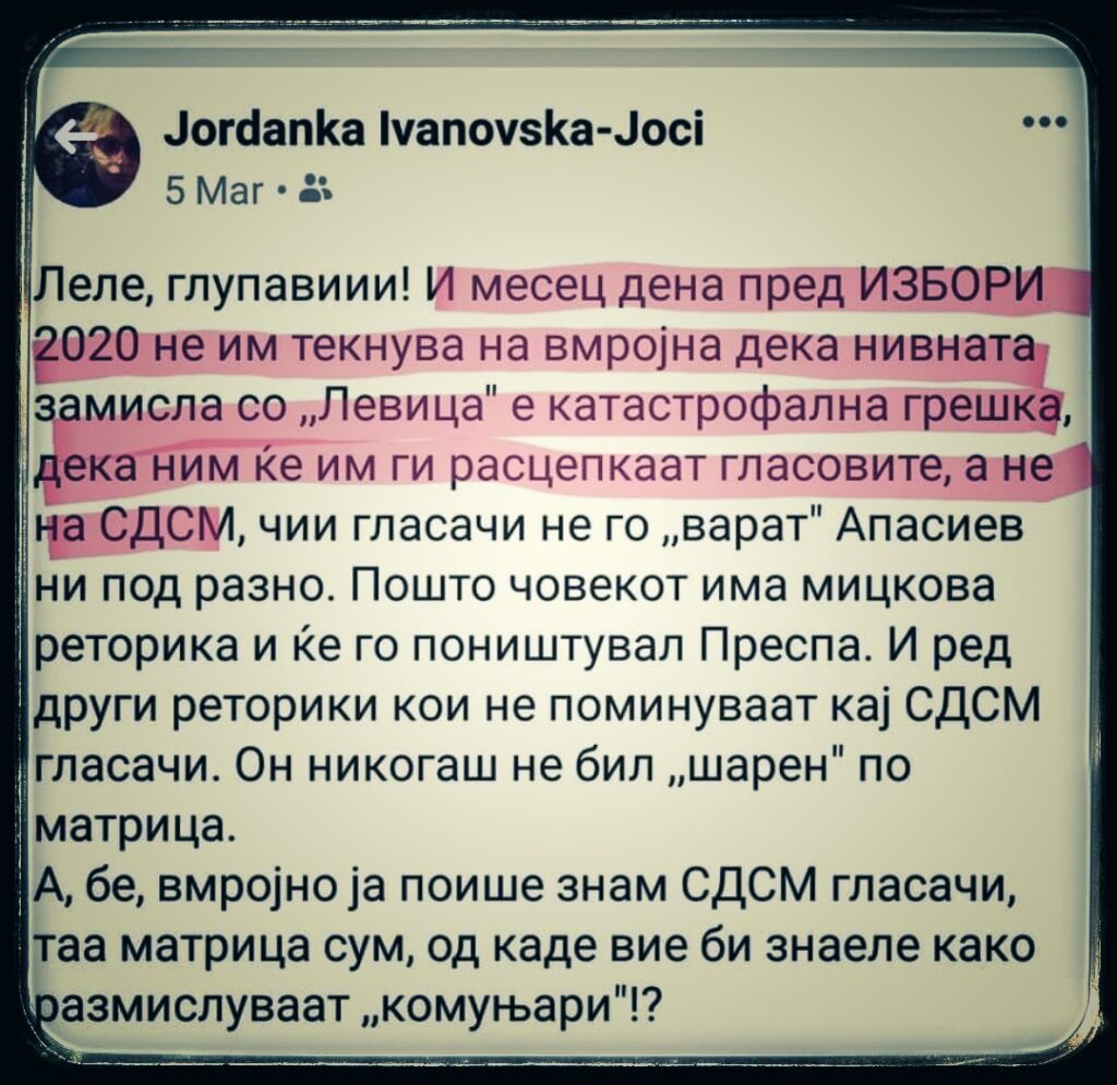 Мицкоски, вечерва, откако ги разгледал и восприемил анкетите на ,,Телма”, објавени вчера, на Димитар Апасиев му порачал дека ќе му даде 44 пратеника, вмровските, па нека го поништи ,,Преспански договор”. Односно, му ги дава пратениците за да го исполни она кое го ветува ,,Левица” цело време – шири демагогија. Секако тоа е невозможно – да се поништи ,,Преспански”, но Мицкоски конечно сфатил дека треба да ја менува ем реториката, ем тимот кој му ветуваше дека ,,Левица” ќе ,,откине” сдсмовски гласови, а на крај вмровци ги чинеше формирање Влада (добија два пратеника во ИЕ 1 и ИЕ 3 – традиционално вмровска средина ).
