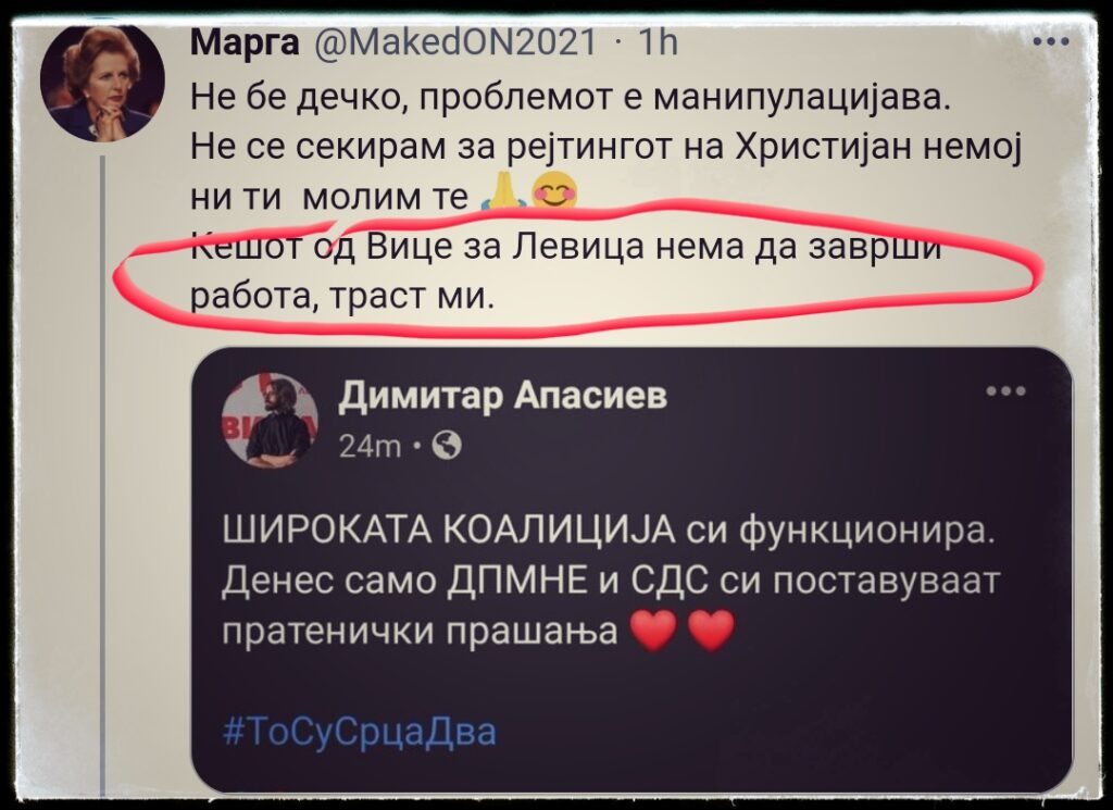 Маргич напишала – ,,Кешот од Вице за Левица нема да заврши, работа, траст ми”⁉️ А, под постот слика од Апасиев.