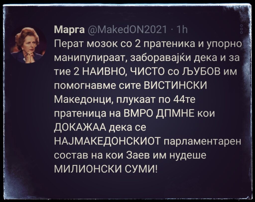 Ивана алијас ,,Марга”, вмровка, која заедно со двоецот Синиша – Киро, со години му го креваа рејтингот на Димитар Апасиев преку вмровската мрежа на лажни профили – наеднаш се освестила и напишала чуден пост на Твитер.