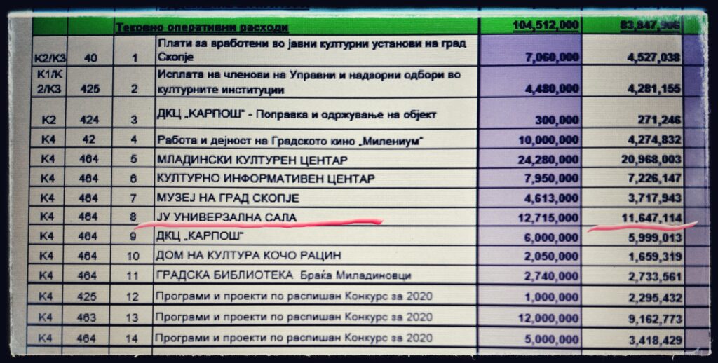 ,,Универзална сала” и МКЦ се двете градски културни установи чии лански расходи се најголеми во однос на сите други – заедно за време на пандемија потрошиле околу 500.000 евра