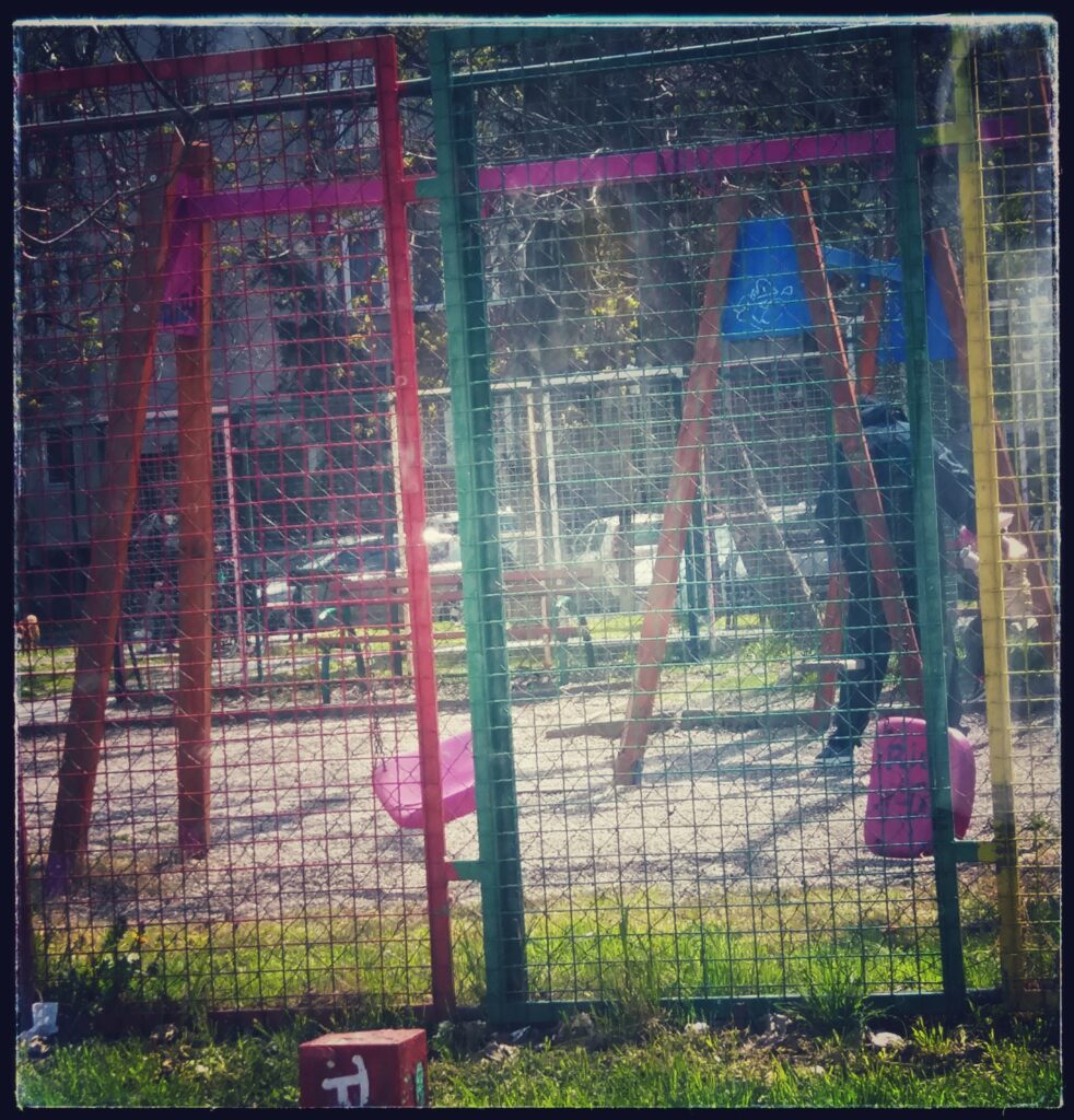 Уништено е и детското игралиште, веднаш до паркот. Реквизитите се искршени, неупотребливи, а со тоа опасни за секое дете. Како никој од локалните власти тука да не поминал со години.