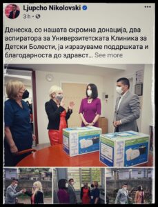 Имаме вицепремиер (претпоставувам со жена му, која била и на фризер), кои донирале два аспиратори за Детска клиника – и тоа е објавено со цела фотогалерија, како да изградиле болница за болни од Ковид-19, а трошоците за пациентите ќе ги сноси Љупчо-Дубаи, од свој џеб.