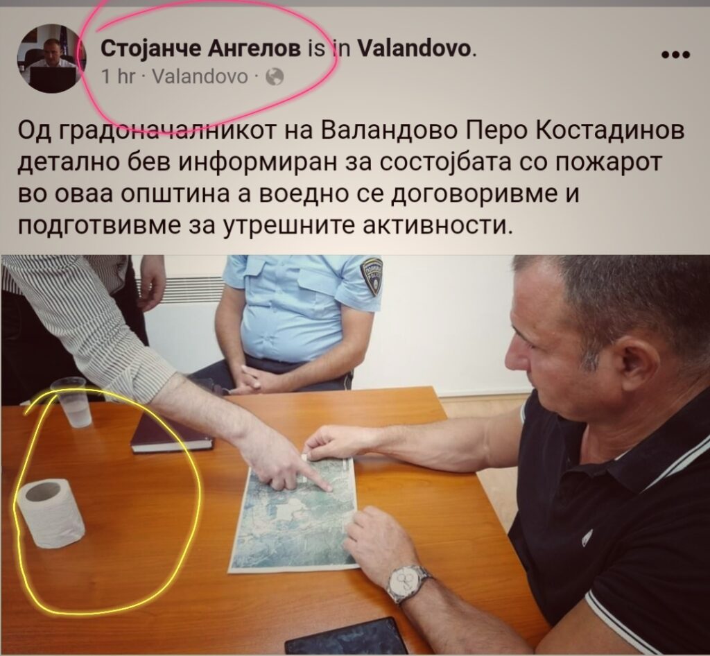 Не, не можам…му дале во Валандово на Стојанче Ангелов, в.д директорот на Центар за управување со кризи (ЦУК) бела тоалетна хартија. И му ја ставиле на маса за неговите ,,кардашијанс” фотосесии, од кои на сите веќе им се лоши. Ќе му затреба тоалетна.