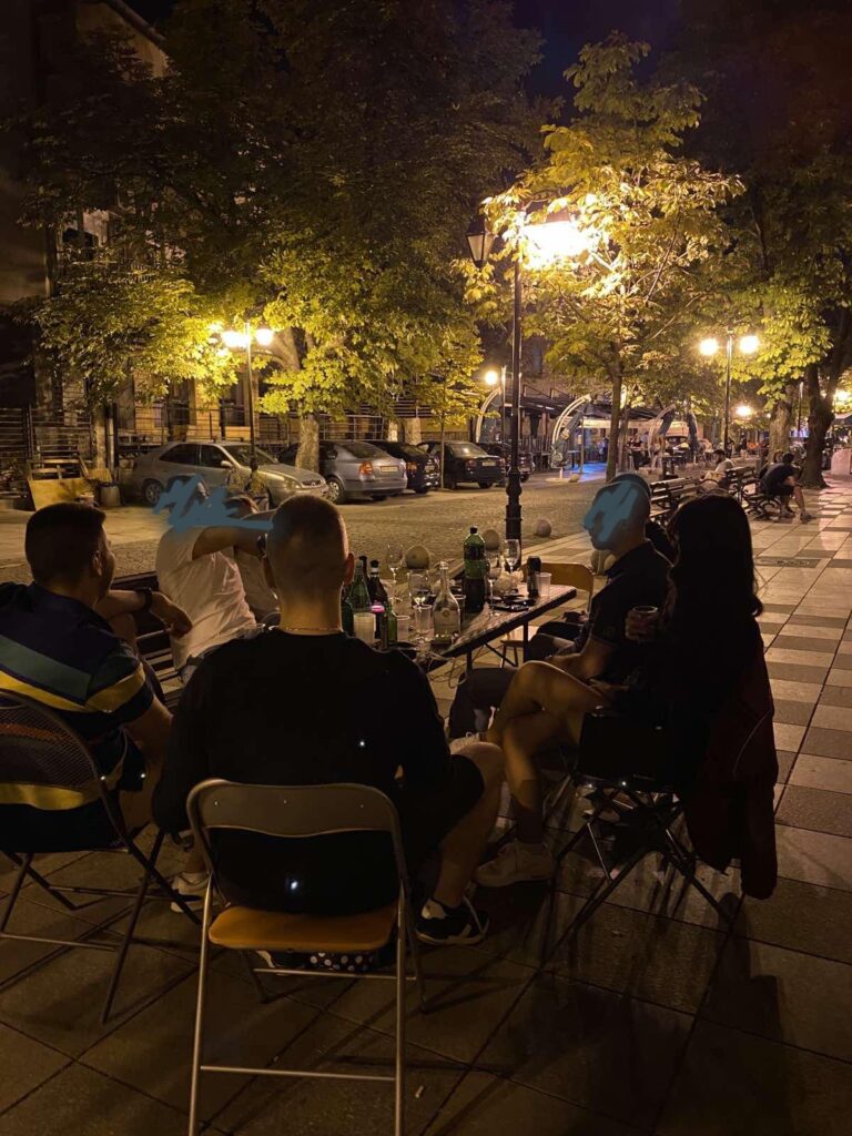 Револтирани, во знак на протест и со јавно изразен, креативен пркос кон владините мерки за забрана за влез во угостителски објекти без вакцинална потврда, група млади луѓе на Боемска улица, пред неколку дена ,,отворија” своја кафеана. На клупи, со столици од дома, уживаат во летната ноќ и имено во животот. И сето тоа во романтичен елемент, со свеќи и храна, притоа широградо во свој стил – ги поздравуваат мерките на владата.