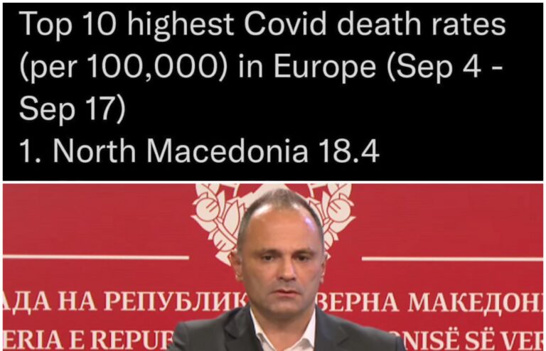 Цел август и септември 2021 година, Македонија е прва на листата по смртност од КОВИД во Европа (на 100.000 жители). А, на 3.место сме по смртност – на милион жители.Бројките се поразителни, а товарот паѓа врз владата и директорите кои ги поставија во изминатите пет години. Во Македонија луѓето умираат како мачки на улица. Дури … Continue reading Два месеца сме први по починати во Европа: Луѓе на СДСМ им умираат како мачки на улица