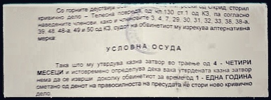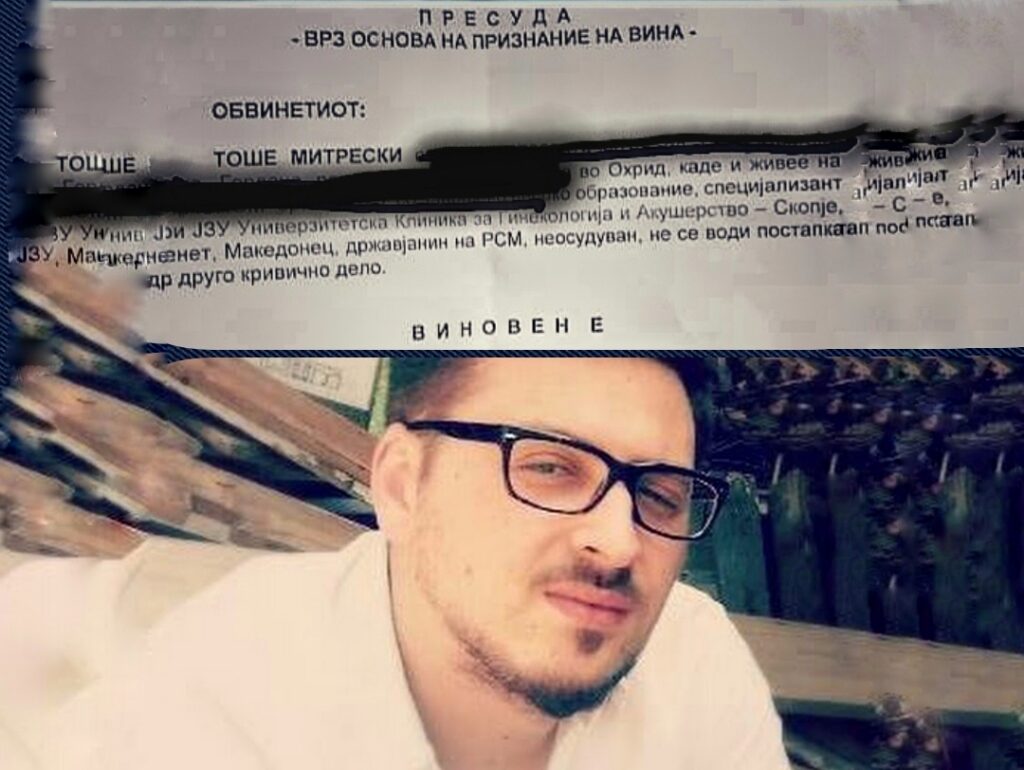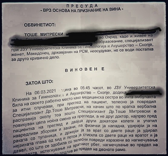Гинекологот Тоше Митрески (33), специјализант на Гинеколошко-акушерската клиника-Скопје, кој на 6 март годинава физички нападна медицинска сестра на работно место, е осуден од Основниот суд на 4 месеци затвор или една година условна казна, но да не го повтори делото.