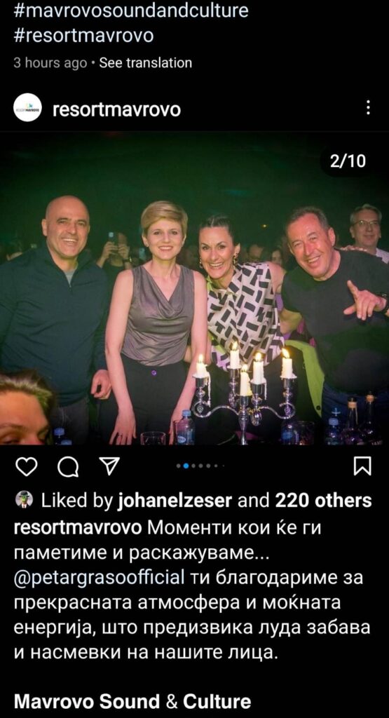 Во време кога после 40 години снема леб на полици по маркети и се зборуваше за воведување категорија ,,социјален леб”, како да сме во војна, бензинот е над 80 денари, струјата е скапа како ,,суво злато”, деца не одат во училишта поради закани со бомби, а родителите се психички исцрпени, притоа луѓе умираат поради недостаток од лекови по болници, премиерот Димитар Ковачевски наголемо вчера се журкал во Маврово на концерт на Петар Грашо. На него и на неговата сопруга која влезе во бизнис со фотоволтаици, им е до забава и до смеење. И сето тоа овековечено на Инстаграм, за цел народ да ги види како се журкаат, чунки донирале бубрег и спасиле човечки живот. Без чувство за реалноста, сé им е рамно, додека цела Македонија едвај крпи крај со крај, а инфлацијата гази.