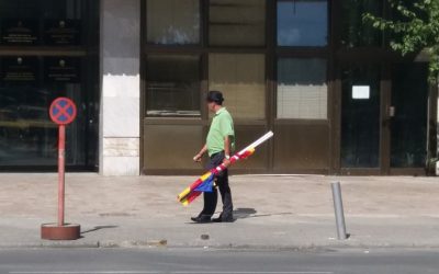Човек, со македонско и европско знаме во рацете, чекори по празна улица, во спротивен правец од локацијата каде започна маршот ,,За европска Македонија” во организација …